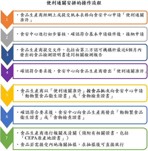 有關申請「便利通關准許」的詳情,請瀏覽申請指引。食安中心會對符合要求的食品生產商及其食品發出「便利通關准許」,並將有關資訊向海關總署備案。