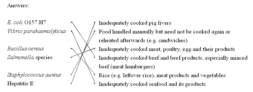The food items on the right are easily contaminated by the germs on the left, leading to food poisoning. Please link them together: