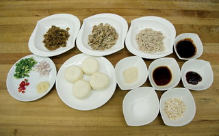 Steamed oatmeal buns, roasted duck meat, minced pork and grandmother vegetables