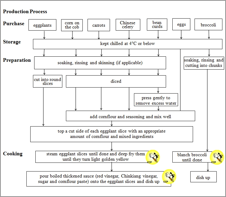 The Critical Control Points in the production of "Eggplant Stuffed with Assorted Vegetables and Bean Curd" are: