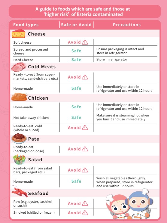 Listeriosis is a foodborne disease caused by Listeria monocytogenes. Though cases of listeriosis are reported infrequently in Hong Kong, there have been a number of overseas cases in recent years. Healthy individuals rarely develop symptoms after exposure to Listeria contaminated food. However, the effect on susceptible populations like pregnant women, newborns, the elderly and immunocompromised people can be severe, and may result in septicaemia, meningitis, encephalitis, miscarriage, stillbirth or premature birth in severe cases.