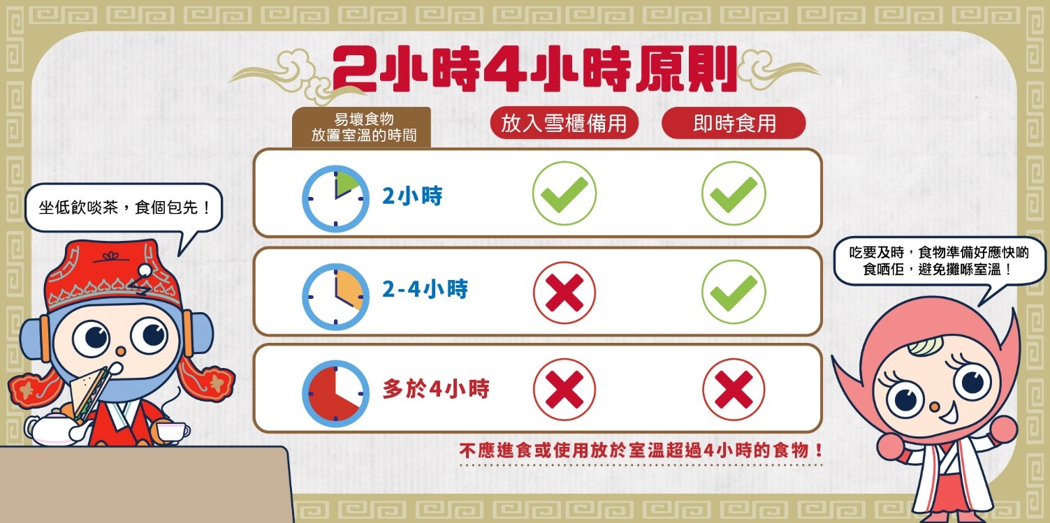 Food businesses should avoid preparing food too far in advance, while deliverers should minimise the time for delivery. During the delivery process, the temperature control requirements for keeping hot food hot (above 60℃) and cold food cold (at or below 4℃) should be fulfilled. If meals cannot be kept at these temperature ranges, the "2-hour/4-hour rule" should be followed (i.e. if prepared food has been kept at room temperature for less than 2 hours, it can be refrigerated for later use or consumed within the four-hour limit; if the food has been kept at room temperature for more than 4 hours, it should be discarded). Food business operators are also encouraged to adopt more measures proactively to prevent food from being tampered with in the delivery process to safeguard food hygiene.
