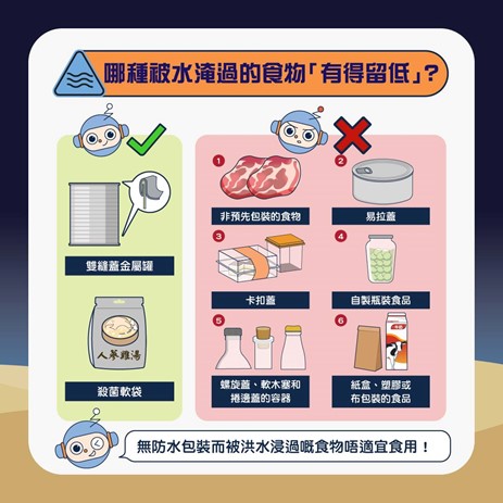 Hong Kong experiences protracted rainstorms from time to time during summer and typhoon seasons, which may lead to flooding in some locations. Floodwater can contaminate food, and adverse weather may cause local or widespread power cuts, resulting in disruption of refrigeration and hence spoilage of perishable food. To provide for a rainy day, it is now a good time to review your contingency plan and follow-up action to ensure food safety.