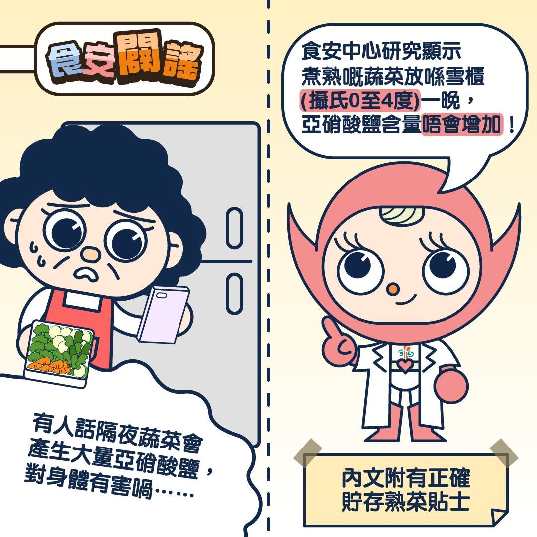 Members of the public are advised to store cooked vegetables properly to delay nitrite formation. Leftovers should be refrigerated within 2 hours after cooking and consumed as soon as possible. Home-packed meals or lunchboxes should be stored in a fridge immediately upon arrival at the workplace.