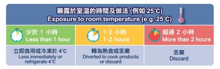 Most pathogenic bacteria multiply rapidly at the temperature danger zone (i.e. between 4°C and 60°C). To ensure the food safety of delivered meals, hot food and cold food should be kept at above 60°C and at or below 4°C respectively during the delivery process. If food is kept within the temperature danger zone, the two-hour and four-hour principle should be followed (i.e. if prepared food is kept at room temperature for less than two hours, it can be refrigerated for later use; if cooked food has been held at room temperature for more than four hours, it should be discarded).