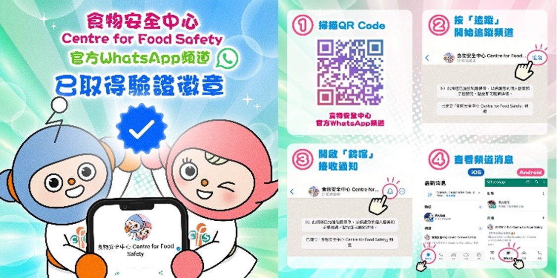 A verified Blue Check badge has been added to the CFS’s newly launched official WhatsApp channel. This certification shows that WhatsApp has confirmed the authenticity of the CFS’s channel. By subscribing to the channel, one can obtain timely updates on local food safety matters and food safety information. These include links to educational videos, food alerts and various food safety related activities. The posts on the channel are enhanced with graphic illustrations and clear explanations to help the public grasp key food safety messages effectively.