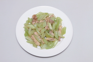 - Add oil into wok. Put the celery in the wok, stir fry until cooked for later use.