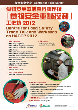 The Centre for Food Safety (CFS) organised totally 24 sessions of Trade Talk and Workshop on HACCP in 2011. Employees of the food business were invited to attend. The CFS hoped, through the talk, to explain and promote to the employees the application of the Hazard Analysis and Critical Control Point (HACCP) System so that the participants could understand the importance of food safety and increase their relevant knowledge and techniques.