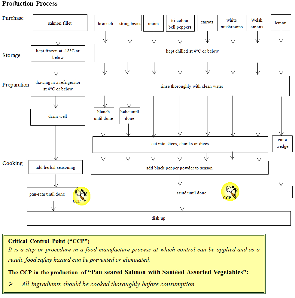 Purchase ingredients from approved and reliable suppliers. | Upon receipt of the ingredients, check carefully to ensure their freshness. Keep vegetables in a refrigerator at 4ºC or below and the frozen salmon fillet at -18ºC or below . |