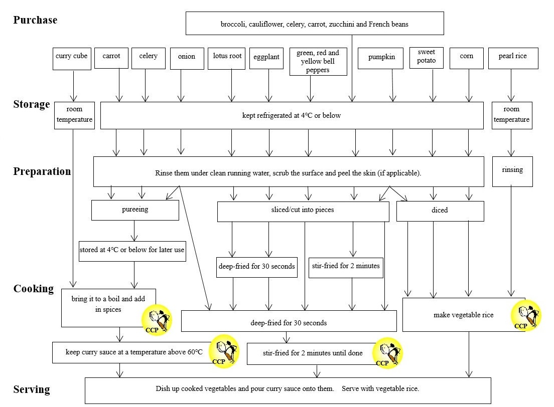 Purchase the ingredients such as curry cube, vegetables, Japanese pearl rice and spices from approved and reliable suppliers. | Upon receipt of the ingredients, check carefully to ensure their freshness. Vegetables should be refrigerated at 4ºC or below for later use. Place the other ingredients in the cabinet in an orderly manner. Foods should be consumed within their shelf life. Stick to the “first-in-first-out” principle and use the oldest stocks with the shortest shelf life first. |