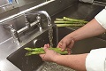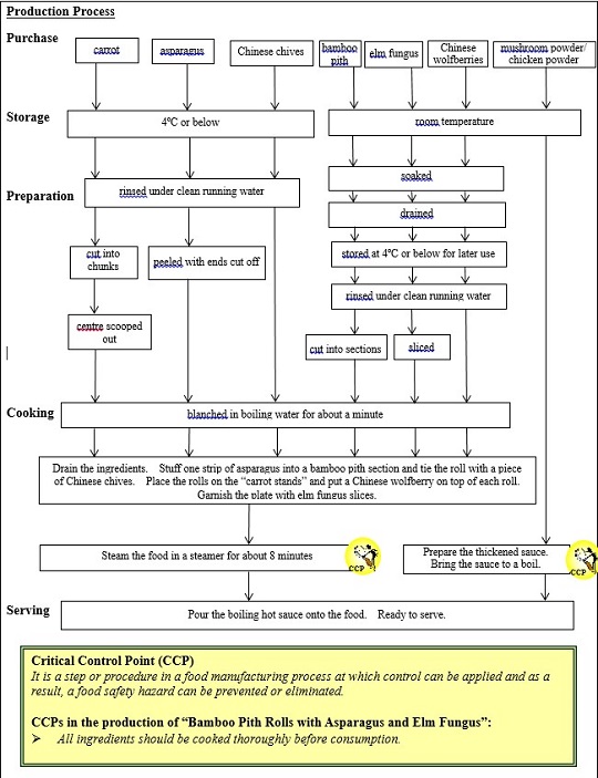Purchase the ingredients such as asparagus, bamboo pith, elm fungus, carrot, Chinese chives, Chinese wolfberries and seasonings from approved and reliable suppliers. | Upon receipt of the ingredients, check carefully to ensure their freshness and quality. Vegetables should be refrigerated at 4ºC or below, while dry ingredients should be kept in a store room under humidity control. Foods should be consumed within their shelf life. Stick to the “first-in-first-out” principle and use the earliest stocks with the shortest shelf life first. |