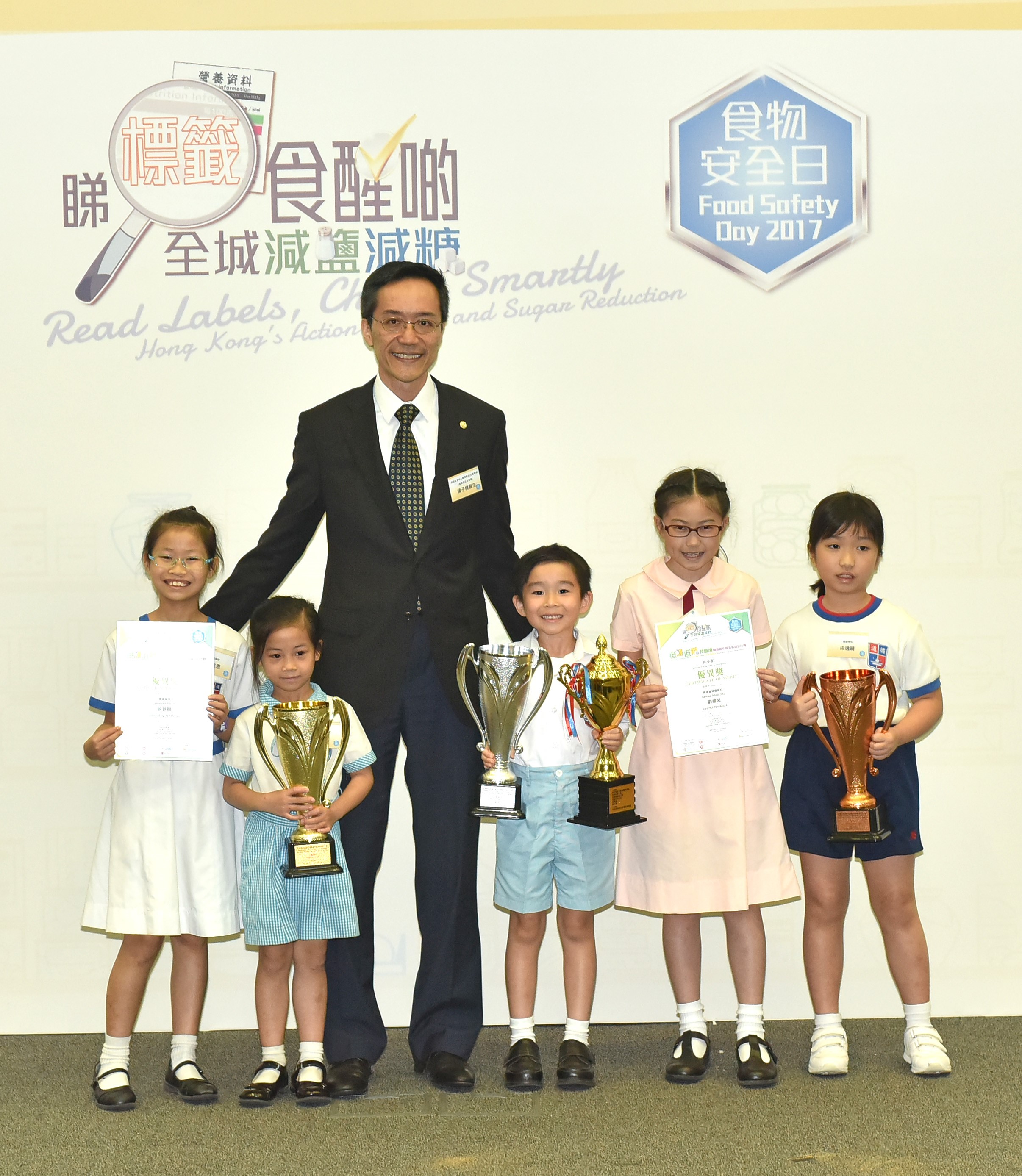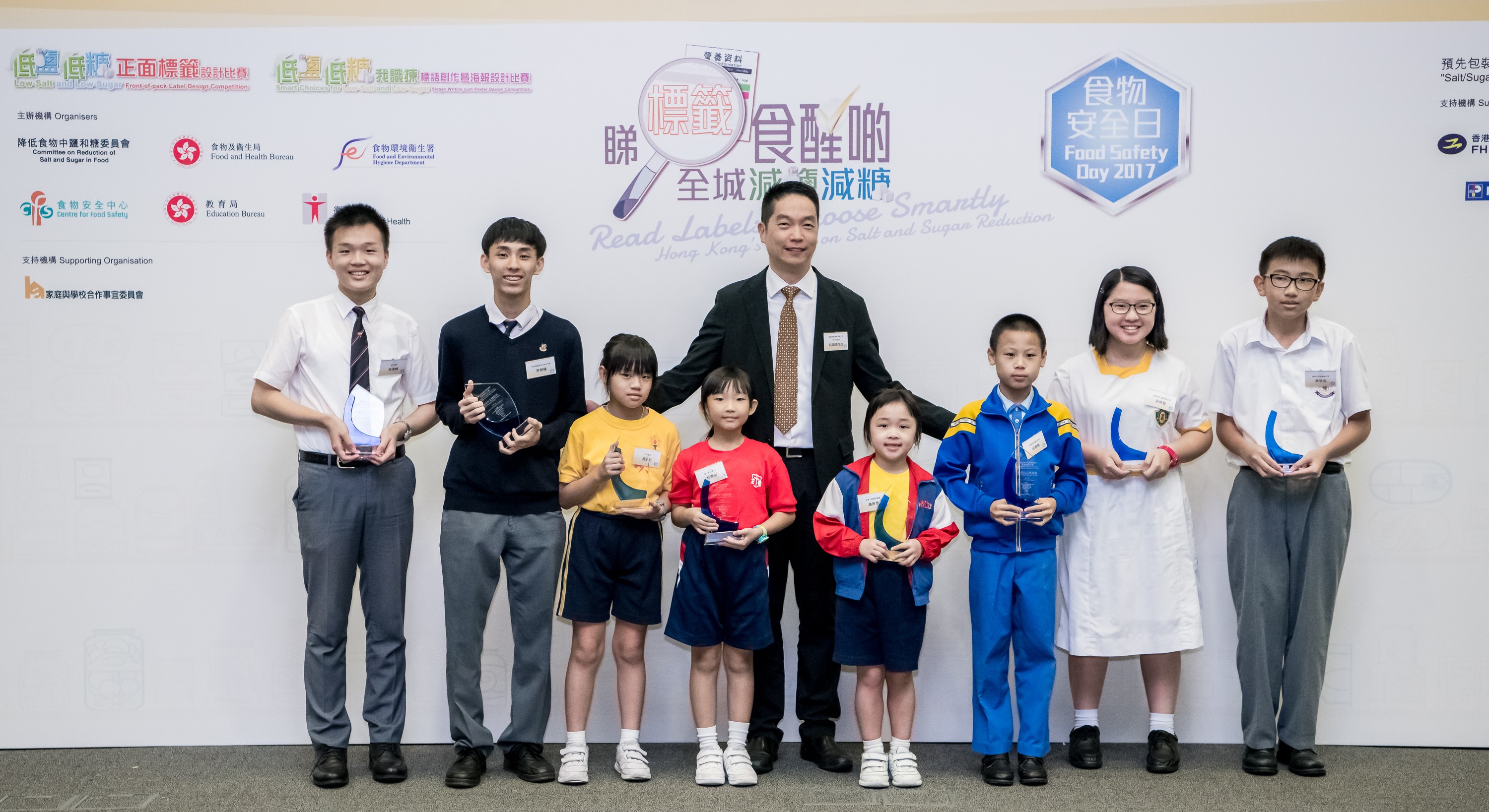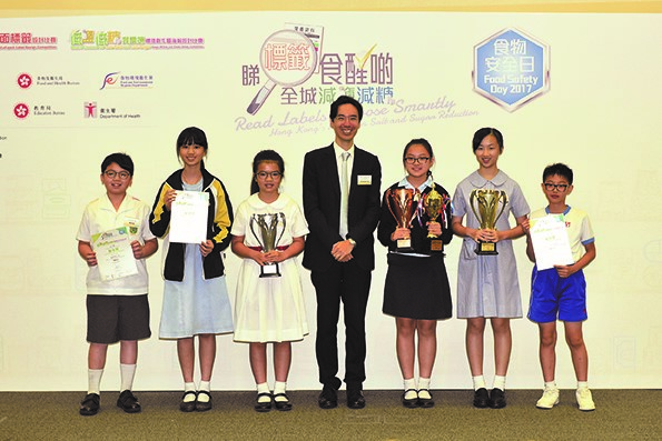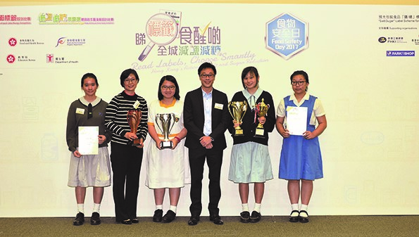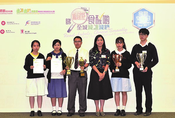 To promote healthy eating and to raise students' awareness of using nutrition labels to reduce dietary intake of salt and sugar, the CRSS, the FHB, the CFS, the Department of Health and the Education Bureau, in collaboration with the Committee on Home-School Co-operation, organised the Smart Choices for Low-Salt and Low-Sugar Slogan Writing cum Poster Design Competition in the year. The prize presentation ceremony of the competition was held on Food Safety Day 2017. The winners of each category are as follows: