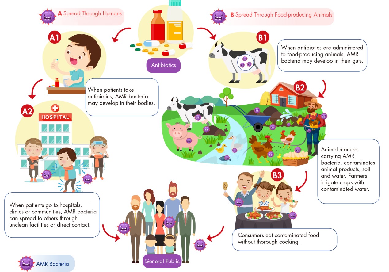 Many factors lead to the rise of AMR. One major contributing factor is the misuse and overuse of antimicrobial drugs, which accelerates the emergence of AMR in microorganisms. When antibiotics are given to sick people or food-producing animals, bacteria susceptible to antibiotics are killed and bacteria with resistant genes survive. Therefore, AMR bacteria may outgrow their counterparts and develop in our bodies or the guts of food-producing animals. These bacteria can spread among the public through the means shown below.