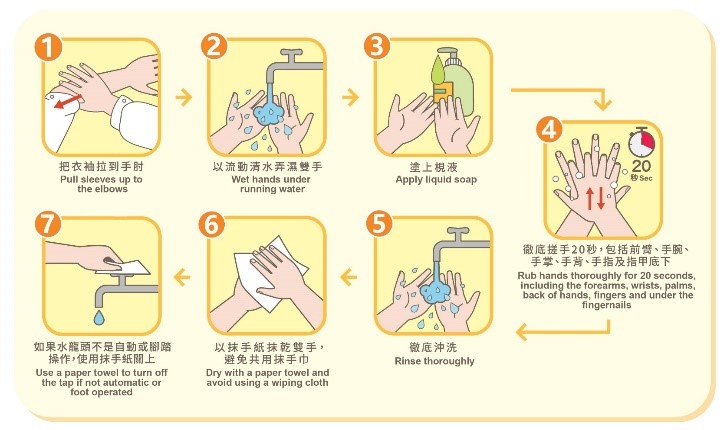 Food handlers should wash hands with liquid soap and water and rub hands for 20 seconds, as liquid soap and water can remove grease and dirt and kill foodborne microorganisms more effectively. To facilitate proper and efficient hand washing, food premises should provide for their staff at the wash basins the following: liquid soap, automatic or hands-free (e.g. foot-operated or elbow-operated) water taps, a continuous supply of clean running water (warm water can encourage hand washing in cold weather), disposable tissues for hand drying and a rubbish bin with an automatic-closing lid. The management of food premises may also display posters of hand washing guidelines to remind staff of proper hand washing procedures.