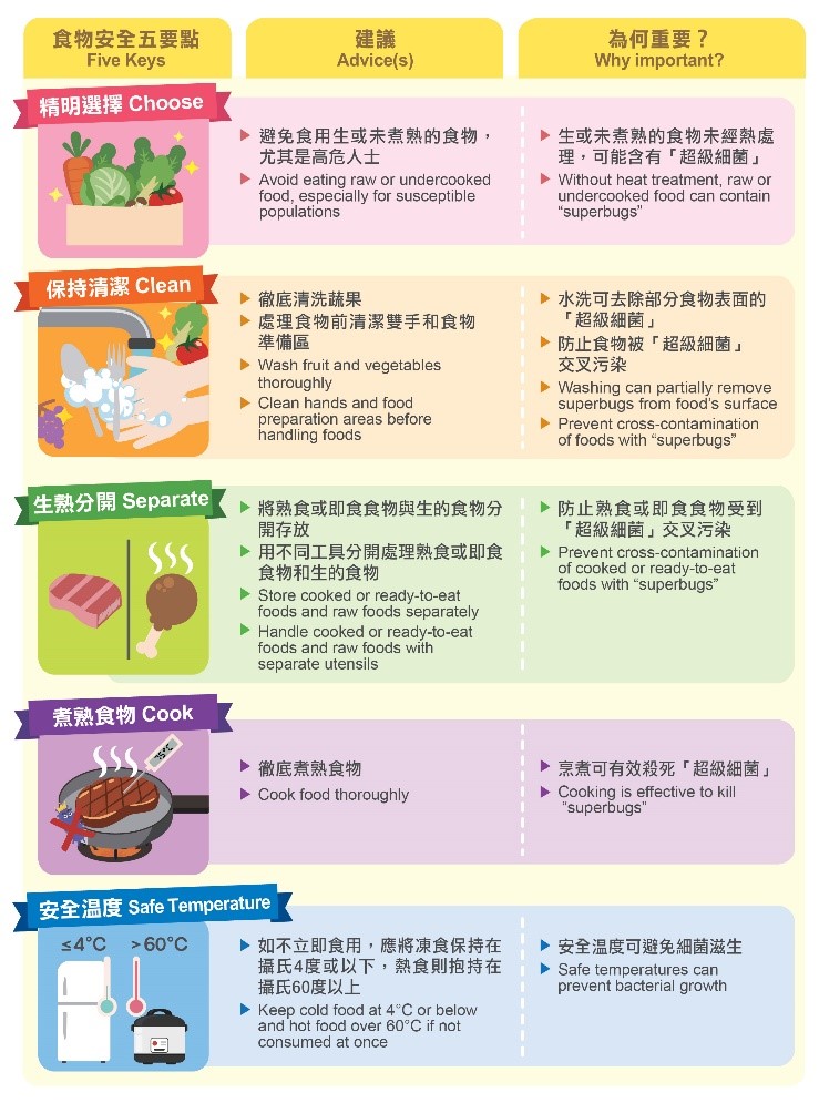 The rise in foodborne AMR will undoubtedly increase the risk of contracting AMR bacteria, but our action should not hinge on whether or not bacteria are resistant. The contamination of food may occur from farm to fork as AMR microorganisms, like foodborne pathogens, exist in the environment. To reduce the risk of contracting both “superbugs” and foodborne pathogens, we should adhere to the “5 Keys to Food Safety” in our everyday lives. On the other hand, susceptible populations such as pregnant women, infants and young children, the elderly and people with weakened immunity (i.e. people with chronic diseases or those on antibiotics treatment, antacid and long-term steroids or drugs given to prevent transplant rejection, etc.) are of a higher risk and should therefore avoid eating raw or undercooked ready-to-eat food that has not been sufficiently cooked to kill “superbugs” and foodborne pathogens.