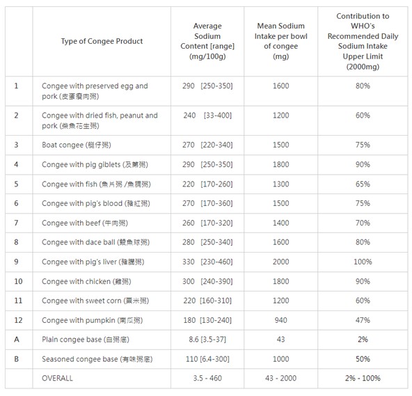 174 samples, including 12 types of Chinese congee with ingredients, as well as the plain congee base and seasoned congee base available as the choice of congee base for cooking, were collected from local Chinese restaurants, fast food restaurants and congee shops for analysis of their sodium content. The study results are shown in the table below. The sodium content of all samples of congee with ingredients ranged from 33mg/100g to 460mg/100g, with an average of 270mg/100g. The wide variations in the sodium content observed within the same type of congee samples suggested the potential for sodium reduction in these congees by the trade. The sodium content of a plain congee base was substantially lower than that of a seasoned congee base, indicating that the sodium intake from the consumption of congee can be lowered to a great extent by choosing plain congee instead of seasoned congee as the base for making congee with ingredients.