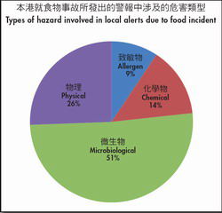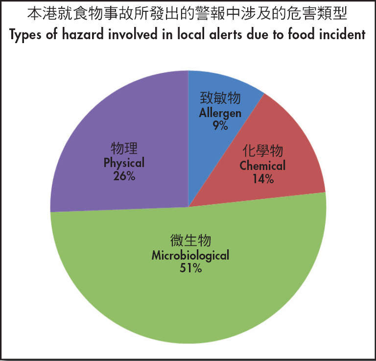 In 2014, the CFS identified about 1 000 food incidents, a figure similar to that in 2013. In addition, another 550 food recalls related to undeclared allergens were identified. In response to these incidents, the CFS had selected at least 40 incidents involving 160 food products and issued 50 press releases, 62 alerts to the trade and 44 alerts to the public. More than half of the selected incidents were identified either locally or from the Rapid Alert System for Food and Feed (RASFF) of the European Union. Types of hazards identified included microbiological (e.g. Salmonella, Listeria, E. coli, etc), chemical, physical (e.g. foreign body, use of substandard substance) and allergen, with microbiological hazard accounting for over 50% of the cases.