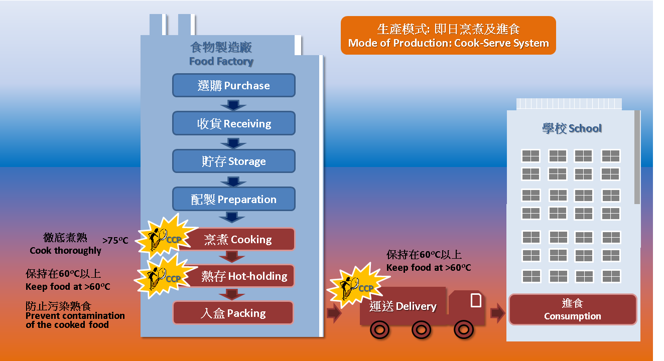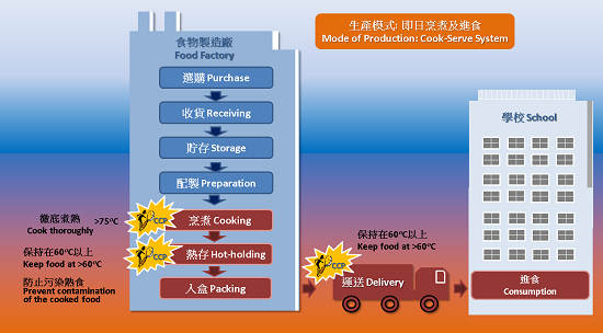Flow diagram of the production of school lunchbox showing the critical control points (CCP) and their control measures