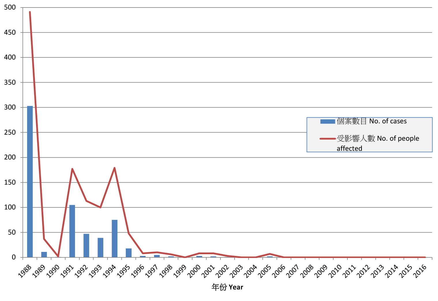 Figure 3: Number of confirmed food poisoning outbreaks and affected persons that were causedby consumption of pesticide-contaminated vegetables, 1988 – 2016 (Source: Centre for Health Protection, Department of Health).