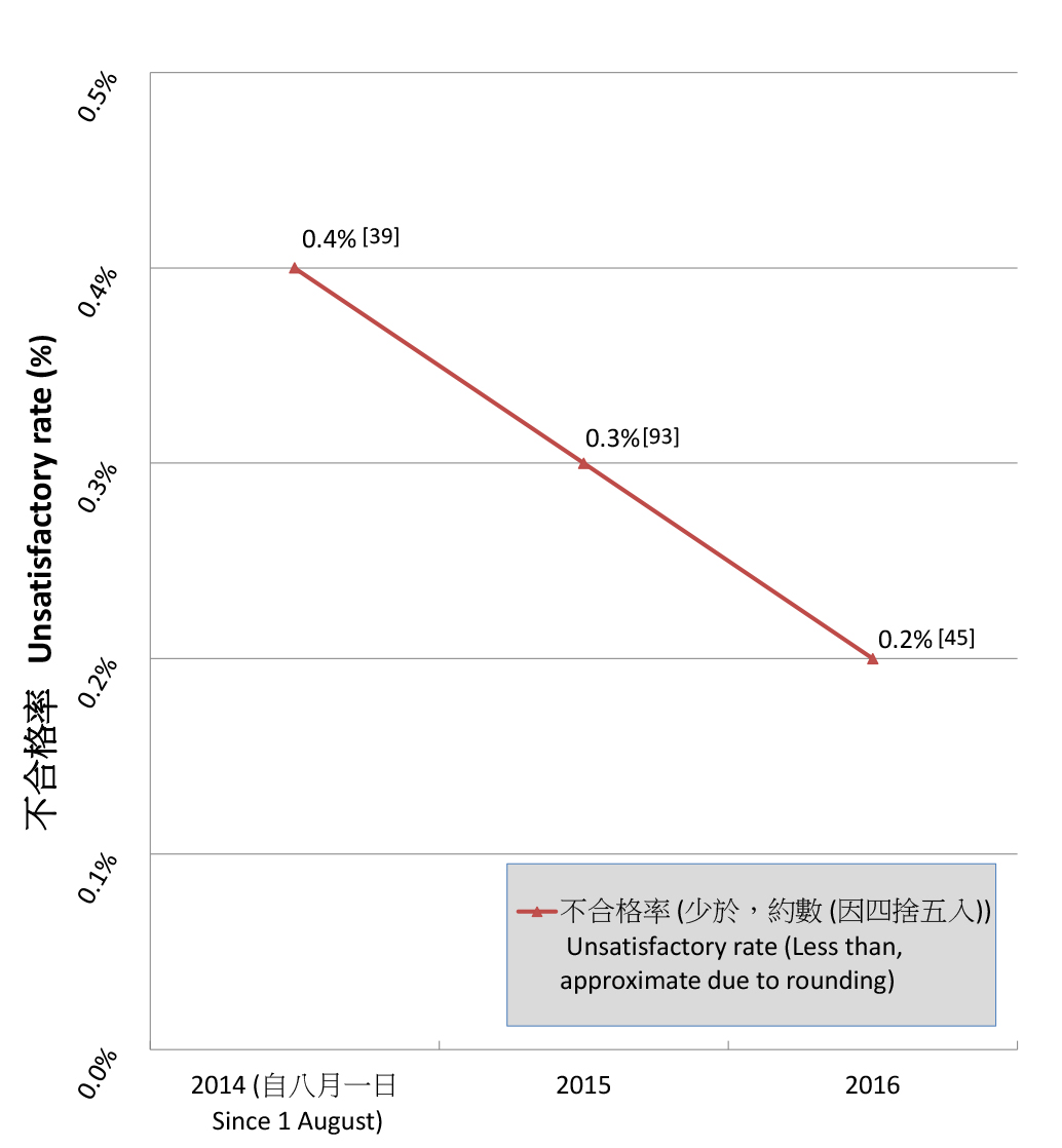 In the past decade, the Centre for Health Protection did not identify any confirmed cases of food poisoning caused by pesticide residues. Furthermore, with the enactment of the Pesticide Residues in Food Regulation on 1 August 2014, control was further strengthened. Between 1 August 2014 and 2016, the CFS took about 91 700 food samples for testing of pesticide residues, and overall only 0.2 % was found not complying with legal requirement (See Figure 4). The figures compared well against European Union (83 000 samples, 3% exceeding maximum residue levels (MRLs) in 2014) and Canada (3 078 samples, <1% exceeding MRLs in 2009 - 2010). Among those small percentage of samples exceeding the regulatory limits, almost all of them would not cause any harm to the consumers' health under normal consumption. The unsatisfactory results merely reflected that GAP had not been followed closely. Only a handful of the unsatisfactory samples may cause chronic health problems for some consumers if consume continuously over a prolonged period of time.