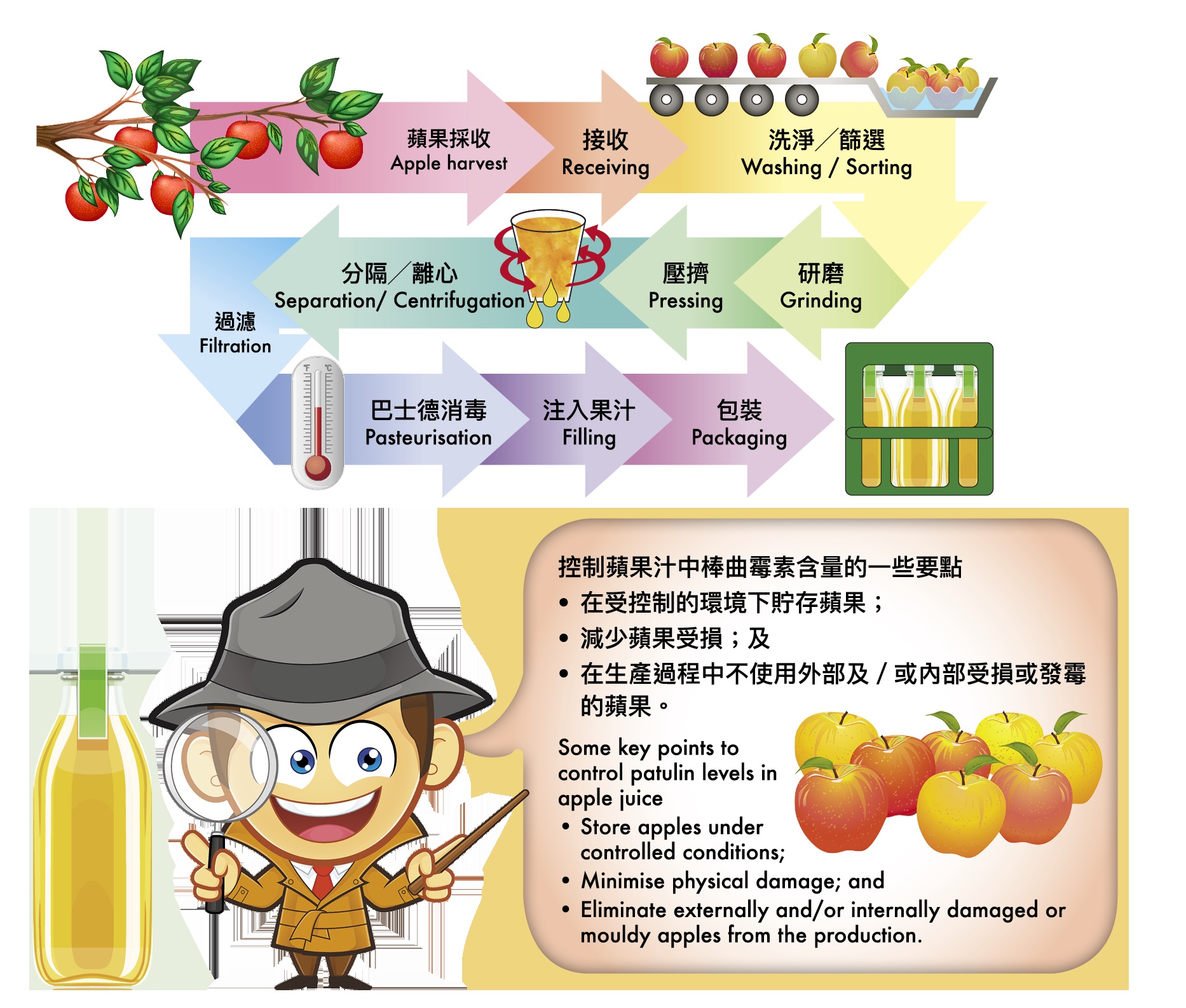 Figure 1: A general flowchart of apple juice production and some key points on controling the patulin levels.