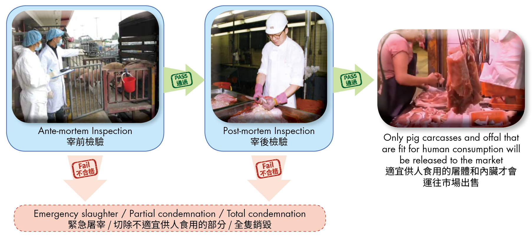 All local and imported pigs have to undergo ante-mortem and post-mortem inspections in slaughterhouses to ensure they are fit for human consumption before being released to the market.