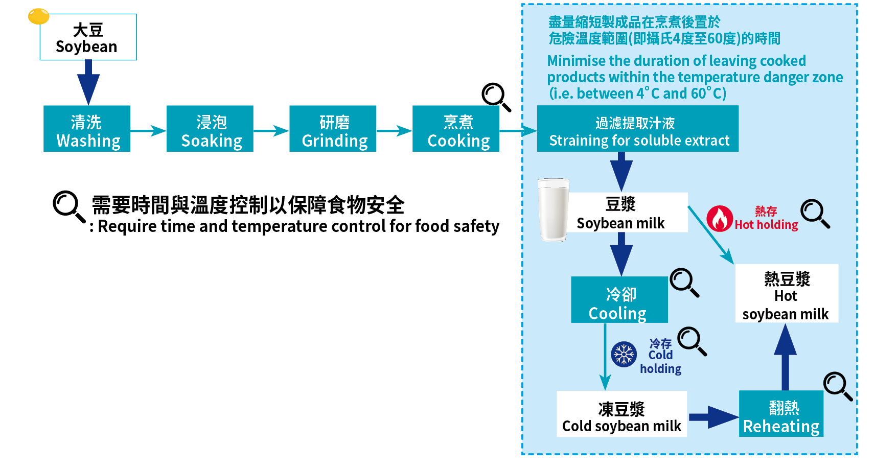 After cooking, it is important to minimise the duration of leaving cooked products within the temperature danger zone, i.e. between 4°C and 60°C, in order to prevent the growth of vegetative cells of B. cereus formed from surviving spores. Cooked soybean slurry is strained through cheese cloth for soluble extract, i.e. soybean milk. After straining, freshly made soybean milk can be held at above 60°C for hot serving. As for cold soybean milk, it has to be cooled as quickly as possible, i.e. cooling to 20°C within two hours, and then to 4°C within the next four hours or less. Cooled soybean milk can then be stored at or below 4°C for cold serving. At certain food service businesses, soybean milk in cold holding may be reheated for serving. In that case, it has to be reheated with temperature reaching at least 75°C.