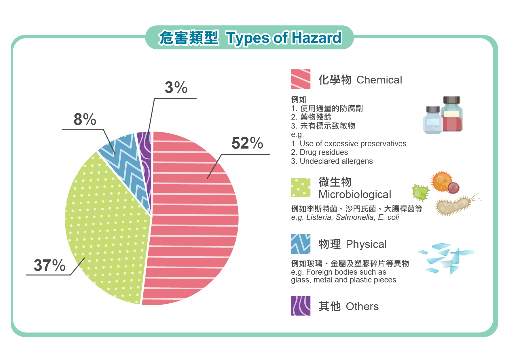 In 2020, the CFS issued 215 food incident posts, 15 trade alerts, 14 food alerts and 14 press releases. The hazards identified in these incidents include chemical (e.g. use of excessive preservatives, drug residues, undeclared allergens, etc.), microbiological (e.g. Listeria, Salmonella, Escherichia coli, etc.), physical (e.g. foreign bodies) and others. Over 50% of the incidents were related to chemical hazards (see Figure 1).
