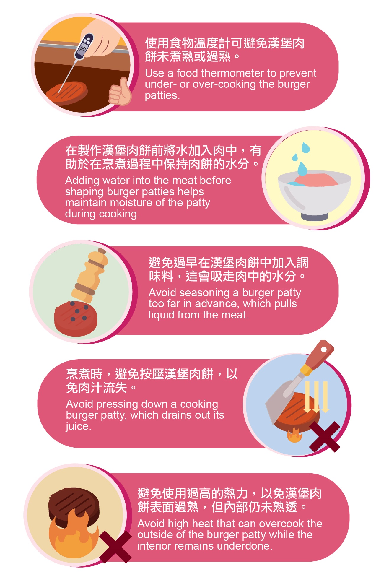 Most food handlers did not use a food thermometer to verify doneness, relying on subjective indicators such as texture and colour instead. When the temperatures were measured on site, all medium and most medium-well burgers as ordered were found to be undercooked, in other words not achieving any one of the safe internal temperature-time combinations. When the interviewed restaurants were requested to prepare well-done burgers, about one-fifth of them were still found undercooked. As a result, this might endanger customers who unintentionally ate the undercooked burgers. On the other hand, several food handlers overcooked their patties, say the internal temperature reaching over 85°C for a few minutes, while asked to prepare a well-done burger. This explains why they thought well-done burgers were dry and would be, therefore, refused by diners. In fact, thorough cooking does not mean sacrificing the flavour and juiciness of the patty. There are some practical culinary tips that both the trade and the public could consider (Figure 2).