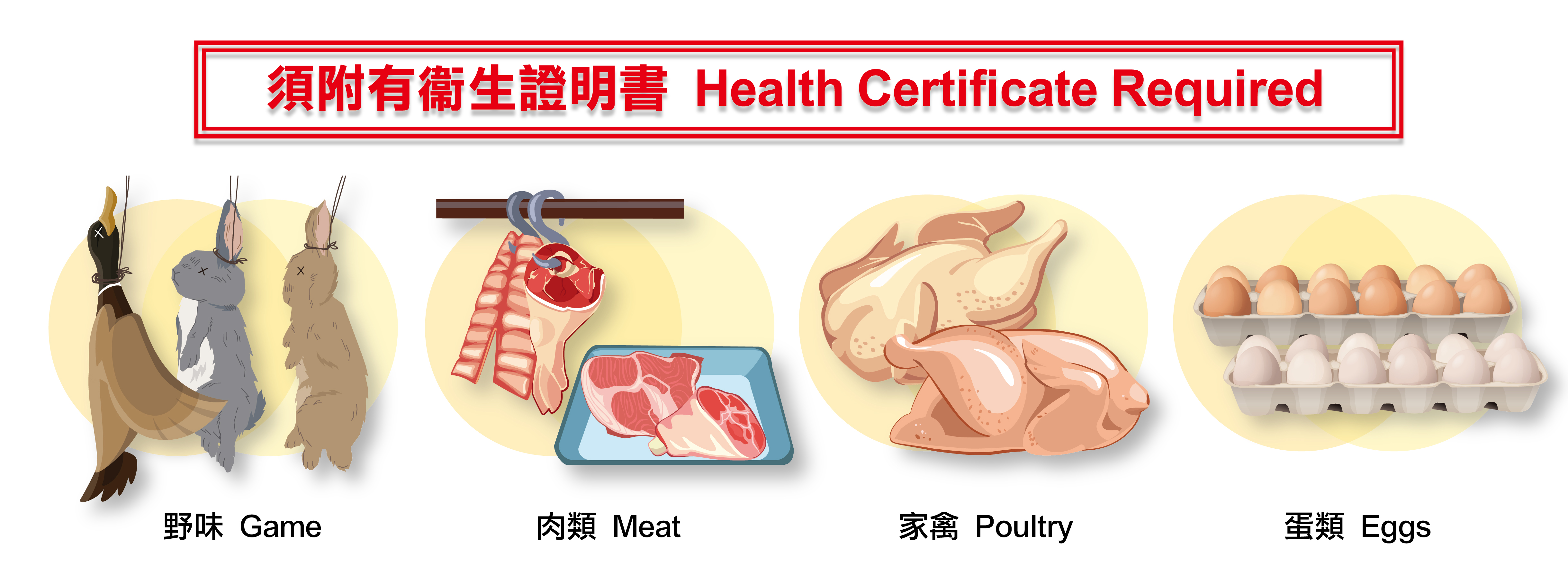 - The import of regulated food including game, meat, poultry and eggs should be accompanied by a valid health certificate and/or written permission from the FEHD.