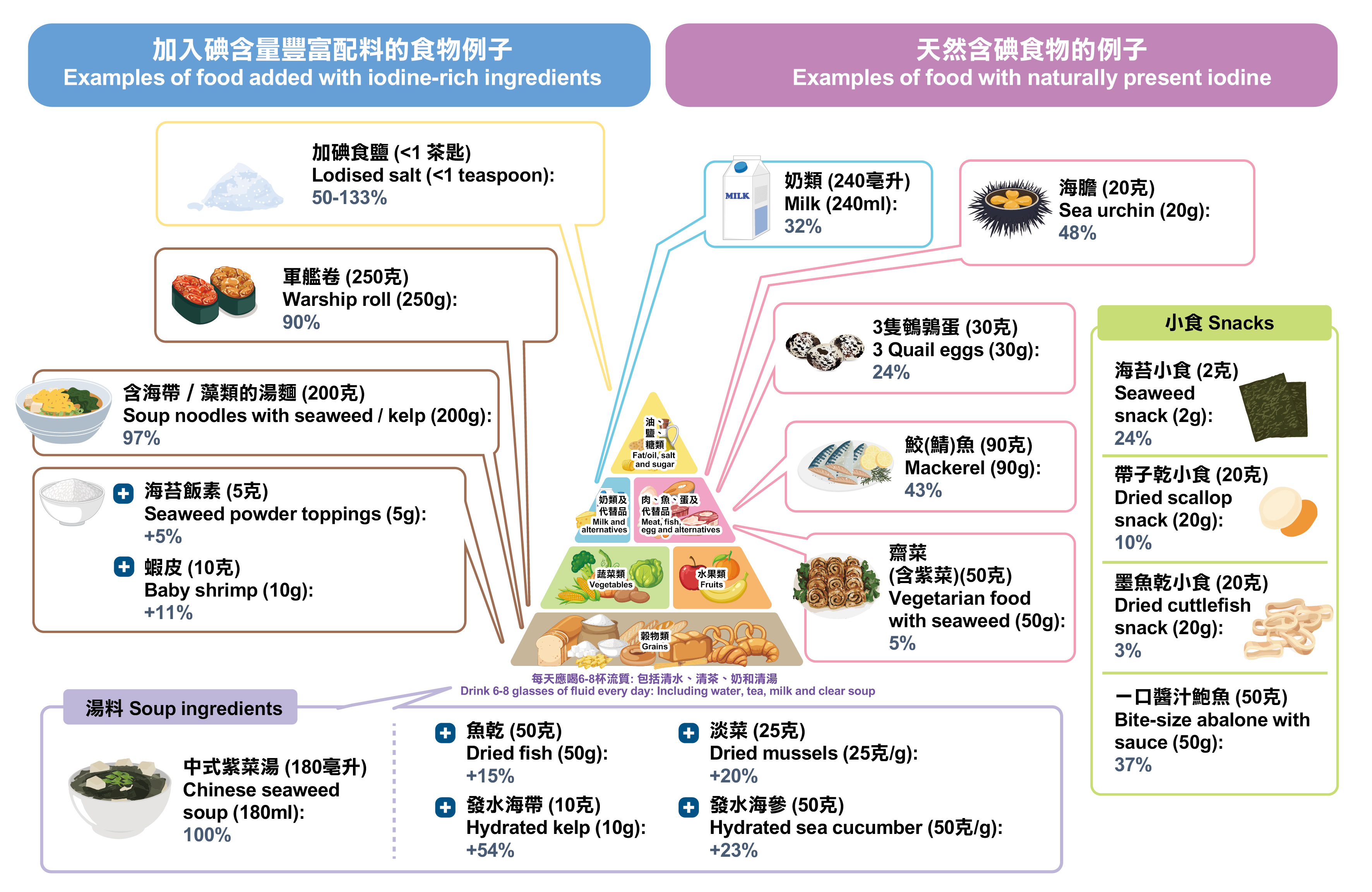 Last month, the CFS reported the iodine content of about 300 foods obtained from local stores. The illustration demonstrates that by adding selected foods into different Food Pyramid food groups could significantly contribute to meeting the iodine needs of 150 μg/day.