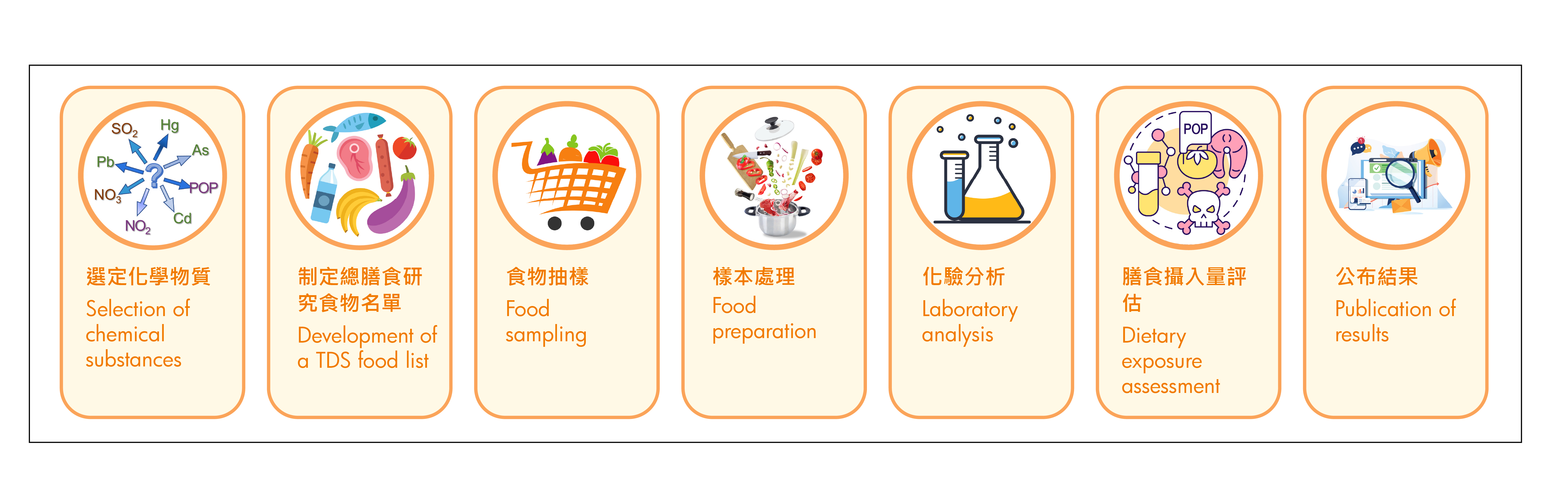 The 2nd HKTDS is a large and complex project that systematically evaluate population-level dietary exposure to chemical substances. It employs a rigorous methodological framework comprising: (i) selection of representative foods, designated as 187 TDS food items, based on local food consumption data that reflect typical dietary patterns; (ii) procurement of 2 244 individual food samples throughout one year from the retail market across different districts and online sales platforms in Hong Kong; (iii) preparation of foods using habitual methods (e.g. washing, peeling, cooking) to simulate actual consumption; (iv) laboratory analysis of over 130 selected chemical substances of interest; (v) estimation of dietary exposure for the local population by integrating laboratory analytical results with the latest food consumption data; and (vi) comparison of the dietary exposure estimates against appropriate health-based guidance values to assess public health risks.