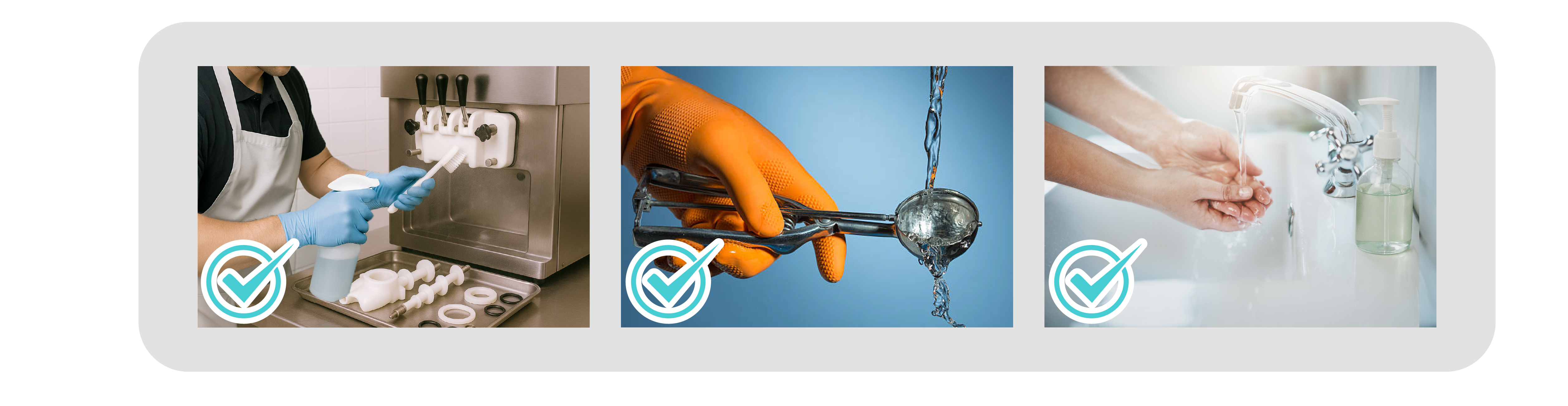 Figure 2: Hygienic measures including (i) dismantle the machine parts (left), (ii) rinse and disinfect the scoop (middle), and (iii) wash hands thoroughly (right) minimise the risk of non-prepackaged frozen confections