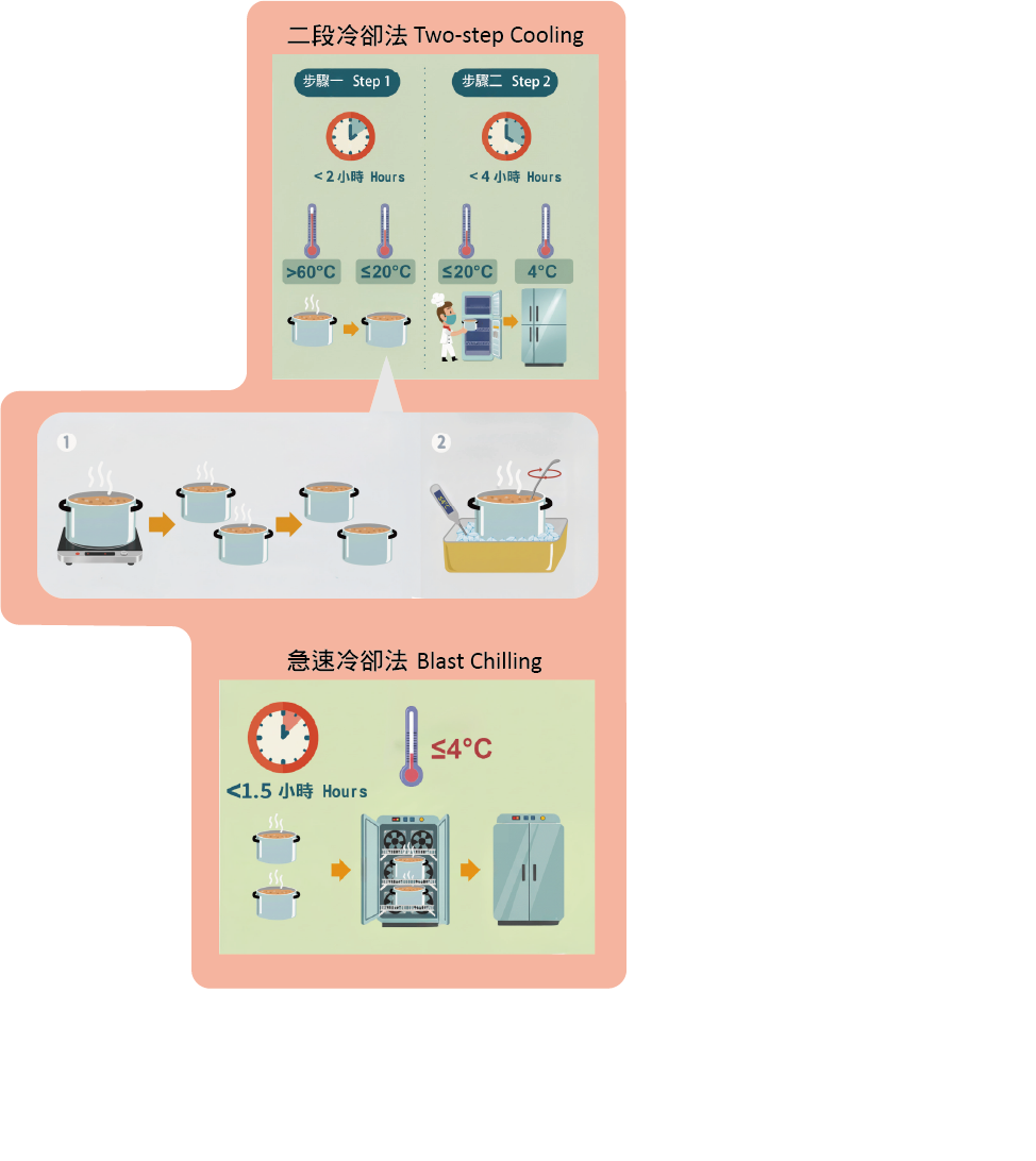 To cool down sauces rapidly, one can take reference from Figure 1 below, where sauces are cooled to 20°C or below within two hours and then cooled further to 4°C in a refrigerator within two to four hours. There are also ways to help speeding up the cooling process, which include preparing sauces in smaller batches, putting the sauce in shallow, covered containers in an area with good air circulation, and placing pans of hot sauces in an ice water bath with stirring. Keep the sauce separate from raw food during cooling. Blast chilling, where smaller portions of food are rapidly chilled to 4°C within 1.5 hours with the use of special chillers, can also be used where available. Sauces should be marked with production date labels and stored separately from raw food in the refrigerator at 4°C or below. Apply the first-in-first-out (FIFO) principle to stock rotation.