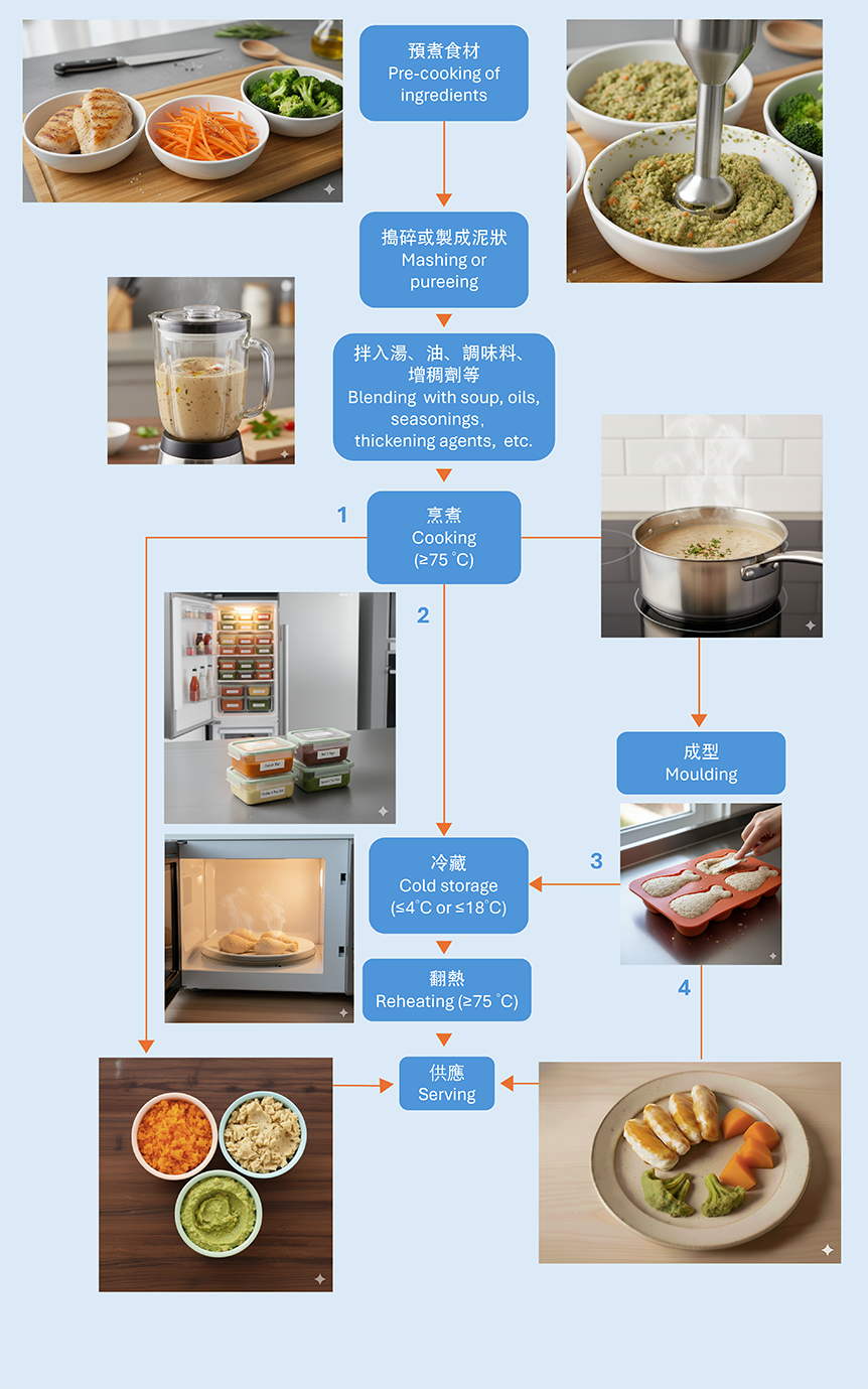 A soft meal (also known as care food in healthcare and caregiving settings) refers to food with a modified texture for individuals who experience eating difficulties, such as the elderly, those recovering from surgery, or those with chewing, swallowing, or digestion difficulties. With an ageing population, the demand for soft meals has surged. To enhance their appearance and taste, some soft meals are thickened and moulded into familiar shapes, such as chicken wings and broccoli florets. Soft meals play a vital role in maintaining the nutrition and well-being of those who rely on them. However, food safety is equally important, as many soft meal consumers, especially the elderly or people with health problems, are more vulnerable to foodborne diseases.