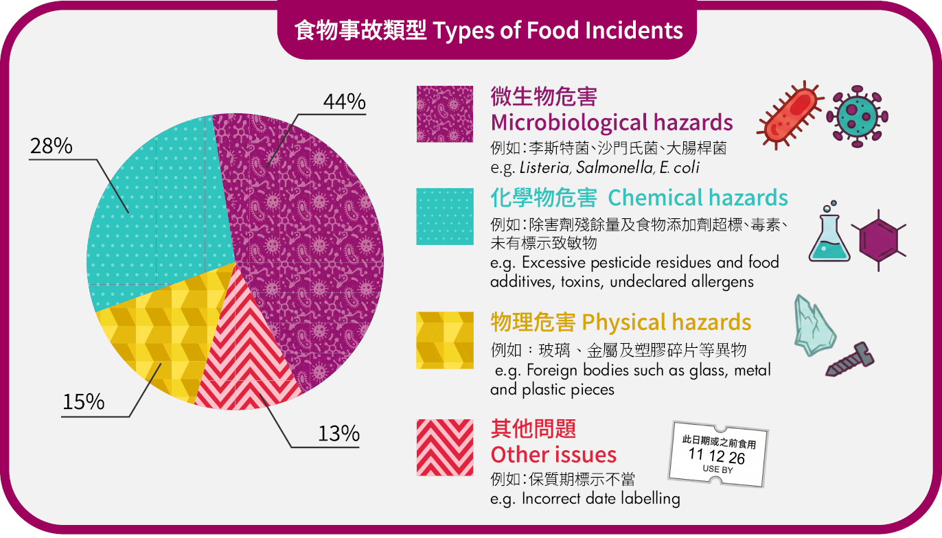 In 2025, the CFS issued 506 food incident posts, 25 press releases, 24 trade alerts and 18 food/allergy alerts, involving chemical hazards (e.g. use of excessive food additives, toxins), microbiological hazards (e.g. Listeria, Salmonella, Norovirus), physical hazards (e.g. foreign matter), and other issues (e.g. incorrect date labelling). The majority of the food incidents were related to microbiological and chemical hazards, accounting for 44% and 28% respectively.