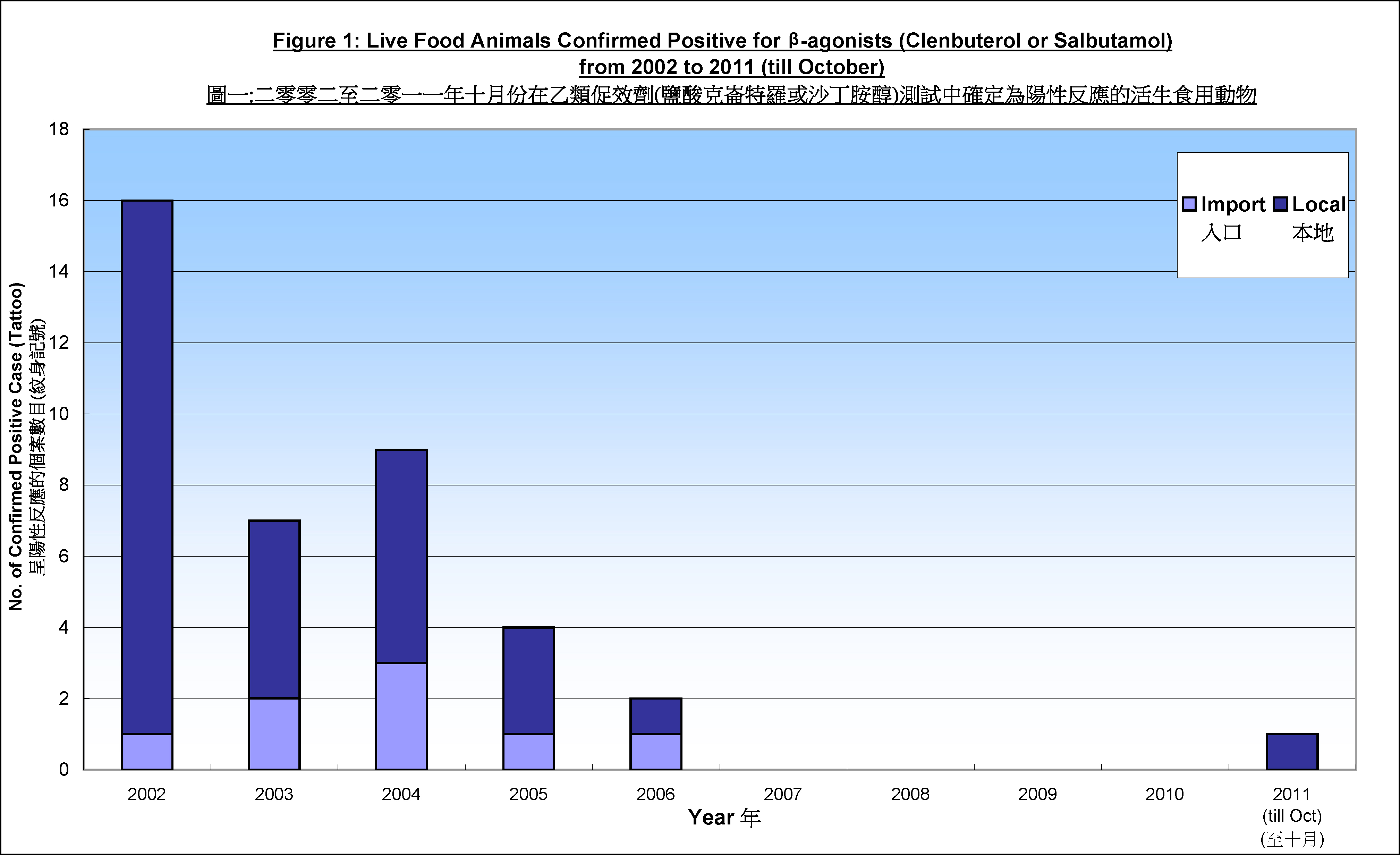 Under the Harmful Substances in Food Regulations (Cap. 132AF) and the Public Health (Animals and Birds) (Chemical Residues) Regulation (Cap. 139N), Clenbuterol and Salbutamol are prohibited in fish, meat or milk, and food animals. Live food animals imported into Hong Kong have to be certified that they are free from these two prohibited drugs. When live pigs are admitted into the slaughterhouses, they are subjected to hold and test for these two drugs. Random samples from each consignment of pigs are taken and only negative samples will mean that the whole consignment can be released for slaughter. For positive samples, all pigs from the same consignment will be isolated and retained for subsequent confirmatory test. If confirmed positive, the whole consignment of pigs would be humanely destroyed. Between 2002 and 2006, cases of Clenbuterol or Salbutamol abuse were identified each year. Since 2007, among the tests for Clenbuterol and Salbutamol, only one batch of pigs has been confirmed to be positive for Clenbuterol from local slaughterhouses (Figure 1).