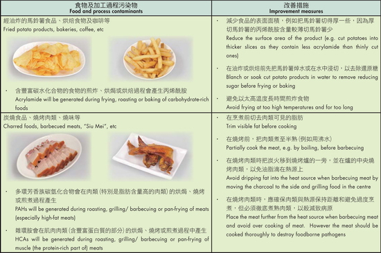 With global efforts made by scientists, industries and regulatory bodies, various measures have been devised to reduce process contaminants related to dry-heat cooking. These mitigations involve modifi cations of recipes and food processing conditions. The Centre for Food Safety has issued two guidelines, A Guide to Manufacturers - Barbecued Meat in 2006 and Trade Guidelines on Reducing Acrylamide in Food in 2011 for trade members. These guidelines include practical and effective ways for reducing acrylamide and PAHs formation in food.