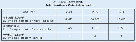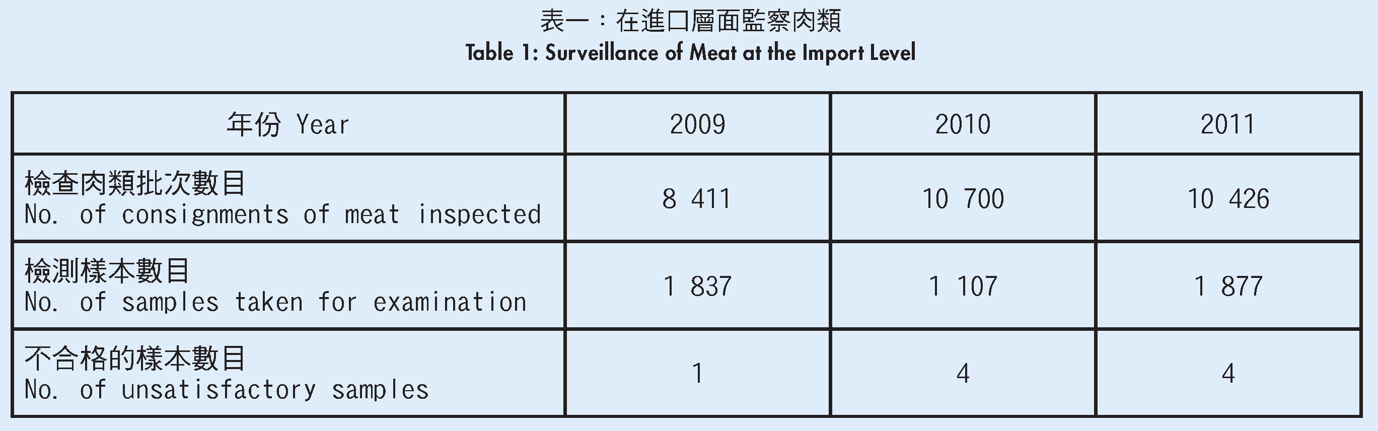 After the CFS is satisfied with the test results of the first six imported meat consignments from a new source, subsequent consignments will be put under the regular food surveillance programme. Samples will be taken at import, wholesale and retail levels for testing on random basis. Over 8 000 imported consignments of meat are inspected by the CFS every year (Table 1).