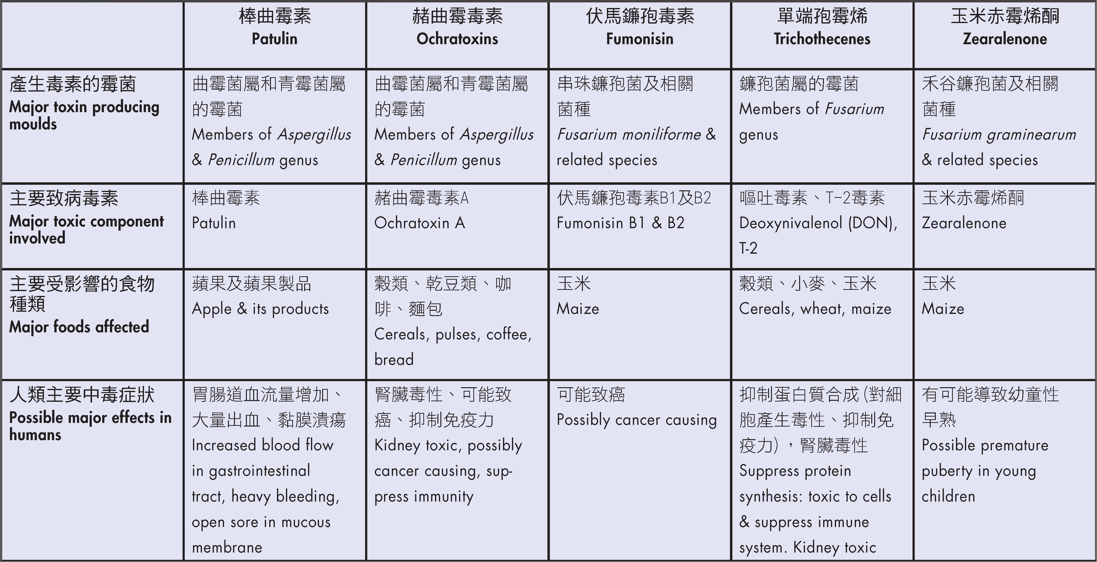 Table: Features of mould toxins patulin, ochratoxins, fumonisins, trichothecenes and zearalenone