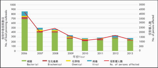 The CFS, in collaboration with the Department of Health (DH), is responsible for the investigation and control of foodborne disease outbreaks related to local food premises and food business. In 2013, the CFS received 285 referrals from the DH on food poisoning outbreaks affecting 991 persons. The annual number of referrals decreased generally from 2006 to 2010 and had since remained more or less stable over the past three years, between 280 to 350 cases per year (see Figure).
