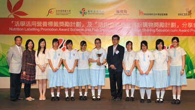 The Chief Curriculum Development Officer (Technology Education), Education Bureau, Mr Sin Tak-wah (fifth right), presents the Nutrition Labelling Promotion Award Scheme (Senior Group) Gold Prize to the Christian Alliance SW Chan Memorial College.