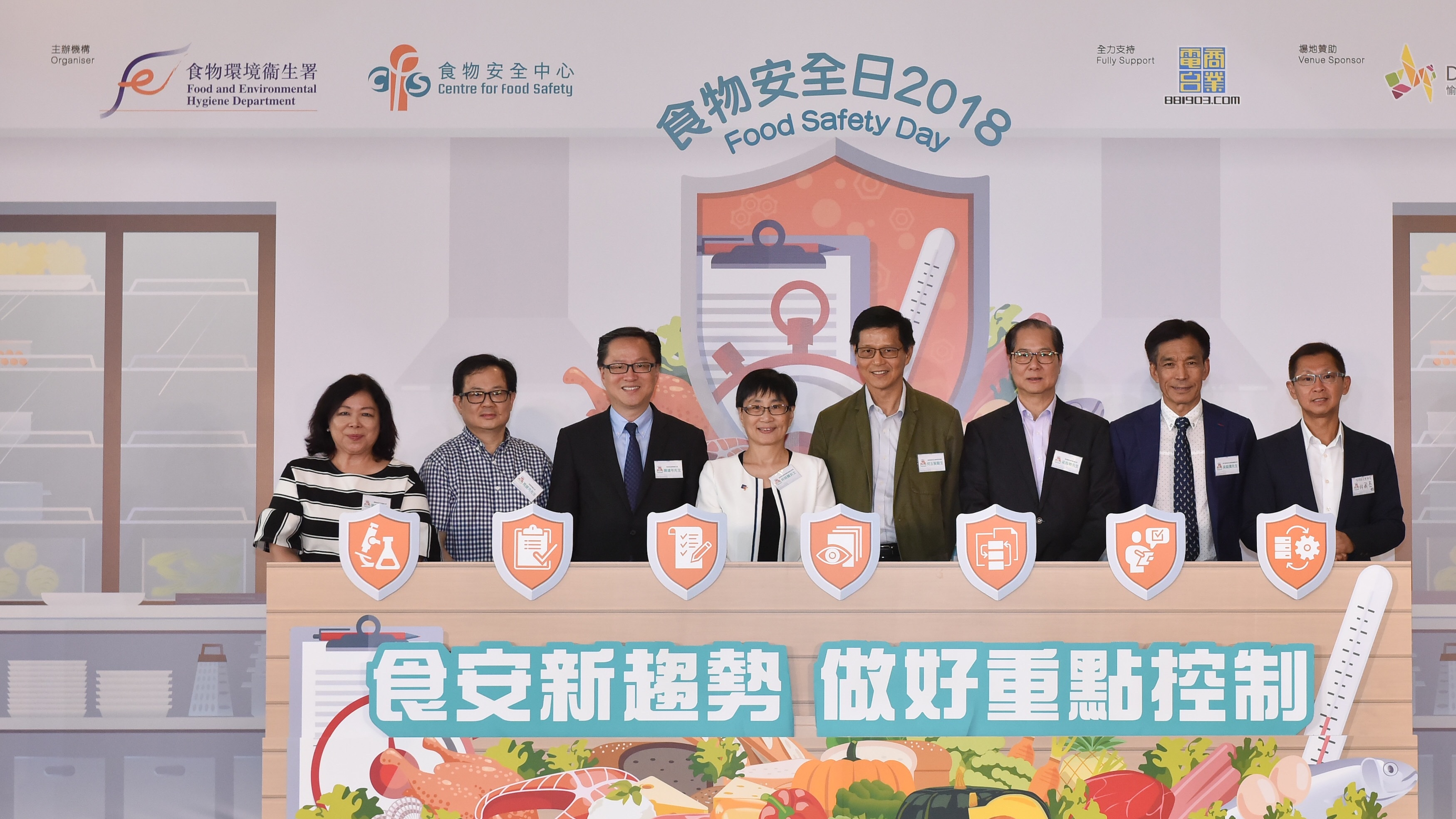 (1) The Centre for Food Safety (CFS) of the Food and Environmental Hygiene Department held Food Safety Day 2018 today (July 17) under the theme "Adopt Food Safety System – Hazard Analysis and Critical Control Points". Officiating at the launch ceremony were the Controller of the CFS, Dr Ho Yuk-yin (fourth right); the Executive Administrator (Accreditation) of Innovation and Technology Commission, Ms Bella Ho (fourth left), and other guests.