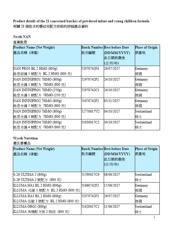 Please refer to the Annex for product details of the 21 concerned batches of powdered infant and young children formula.