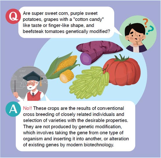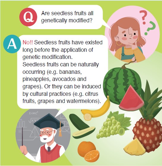 Seedless fruits, like grapes, oranges and watermelons, are commonly found in the local market. Spitting out seeds is socially embarrassing and not enjoyable, therefore, we are welcome to eat fruits without seeds, or at least to a manageable number of seeds. Apart from seedless fruits, crops such as super sweet corn and purple sweet potatoes are also in more demand, as many consumers consider them tasting better or looking more attractive than some other varieties in the market. Although there are rumours that these seedless varieties produced from genetically modified organisms (GMOs), no current seedless crops are GM food.