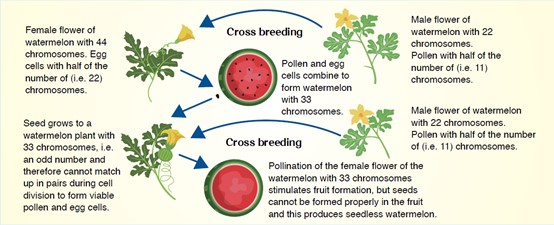 Watermelon generally contains 22 chromosomes but can be induced to double the number of chromosomes to 44 by cultural practices. To produce seedless watermelon, pollen from the male flower of the watermelon with 22 chromosomes is used to fertilise the female flower of the watermelon with 44 chromosomes (the pollen and egg cells of the watermelons contain half of the number of chromosomes, i.e. 11 and 22 chromosomes, respectively). Combining the pollen and egg cells during cross breeding produces fruit with 33 chromosomes, which is an odd number and cannot match up in pairs.