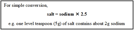 2. The terms salt and sodium are often used synonymously, however, on a weight basis, salt comprises 40% sodium and 60% chloride (1g sodium chloride = 393.4mg of sodium).