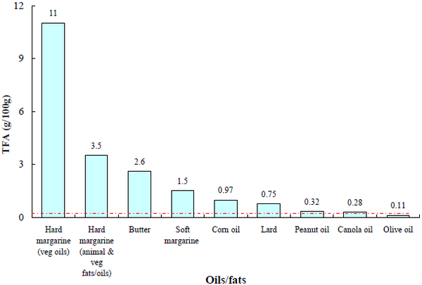 The study revealed that a hard margarine composite sample had high TFA level (11g/100g) and the 4 types of liquid vegetable oils tested had TFA ranged from 0.11g to 0.97g/100g. A tablespoon (14g) of the hard margarine would have contained 1.5g of TFA. Thus for an adult with a daily energy intake of 2000 kilocalories, this would contribute to 68% of the recommended daily TFA intake limit.