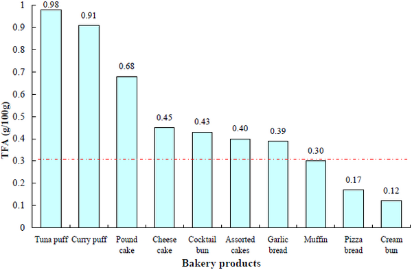 6. In view of growing evidence on the adverse health effects of TFA intake and increasing concern of TFA presence in food, conjointly, the Centre for Food Safety (CFS) and the Consumer Council (CC) have conducted two studies to assess the TFA content in local prepackaged and non-prepackaged foods.11,12 The first study focussed on bakery products, deep fried foods, and margarine/margarine-like spreads. The second study covered a wider range of food products including bakery products, ready-to-eat savouries, instant noodles, prepackaged soups, milk products and analogues, spreads, and chocolate. Among the 80 individual samples in the first study and 85 individual samples in the second one, the majority had TFA not more than 0.3g/100g,. Nevertheless, some products contained relatively high levels of TFA such as a cream-filled bread with shredded coconut sample, a doughnut sample, and a Chinese pastry sample.