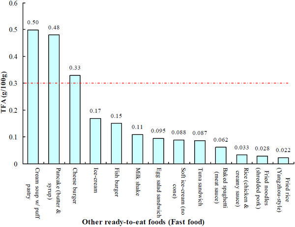 The results showed that the TFA content of these foods varied greatly. On a per 100 grams (g) basis, about 70% (41/59) of foods had more than 0.3g of TFA, whereas 24% had more than 0.3g but not more than 1.0g, 5% had more than 1.0g but not more than 5.0g, and 1% had more than 5.0g. The highest TFA (mean [range]) content was in oils/fats (2.3g [0.11-11g]), followed by bakery products (0.48g [0.12-0.98g]), dairy/dairy-like products (0.30g [0.028-0.78g]), other ready-to-eat foods (0.13g [0.022-0.50g]), snacks (0.073g [0.013-0.23g]), and beverages (0.020g [0-0.069g]).